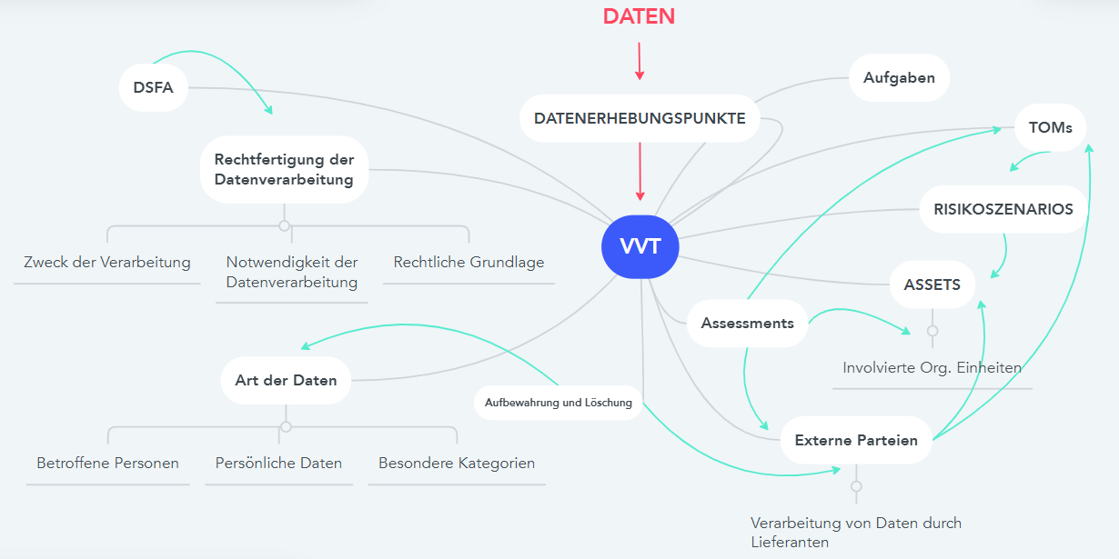 - Das Herzstück ist das Verzeichnis der Verarbeitungstätigkeiten (VVT) das alle organisatorischen Vorgänge im Zusammenhang mit personenbezogenen Daten dokumentiert.